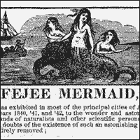 Mermaid hoaxes were perhaps popularized by P.T. Barnum and his famous circus. He advertised having the remains of a FeeJee Mermaid. FeeJee is the sucker spelling of Fiji I believe. Rotten.com describes these supposed remains as looking like a Hollywood pitch gone wrong: “It’s like Gremlins meets Piranha meets Ebirah!” PT Barnum went ahead and used drawings of traditionally attractive mermaids in order to lure crowds. It’s the damn patriarchy keeping abominations down. The three ring huckster need not have bothered apparently, as the attraction continued to appear before sell out crowds even after Barnum publicly confessed that the mermaid was a hodge podge of glued-together parts from totally unrelated critters. (via rotten.com)