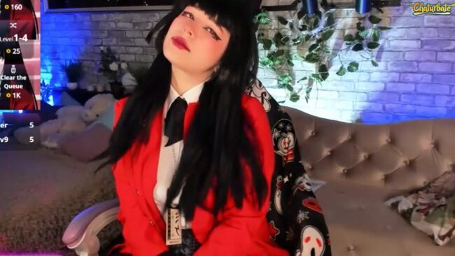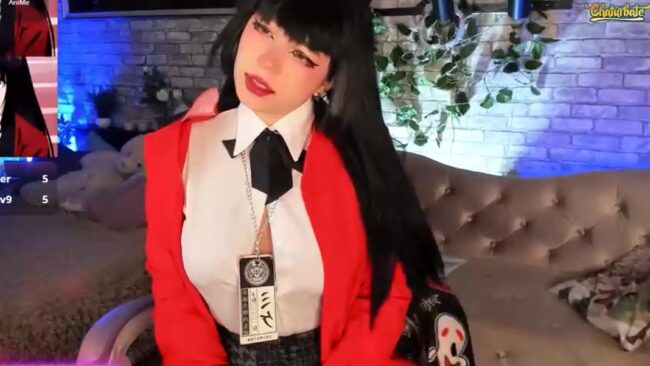 Alex_Howell’s eyes are red, just like the character from the Kakegurui anime, and she wears the elegant ensemble spectacularly, especially when she does a reveal that lets her jacket fall open fully, revealing not just her amazing attributes but also a little hint of more through one of the undone buttons on her blouse.