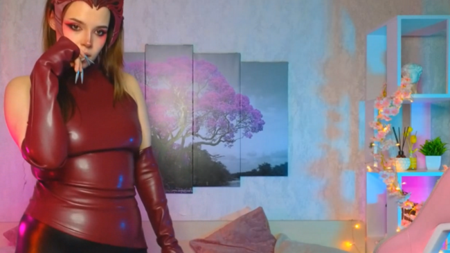 I love the reds on the costume, and how the black pants lend contrast to make Hollisbelch’s gorgeous figure stand out even more while she plays, hypnotizing us with her grace and initiating an activity where she dances and slowly begins to show us more spicy stuff while she keeps the fantasy alive by leaving a lot of the elements of the cosplay present, so we can completely enjoy Hollisbelch’s mischievous version of Scarlet Witch dazzling us with lots of intense demonstrations of allure.