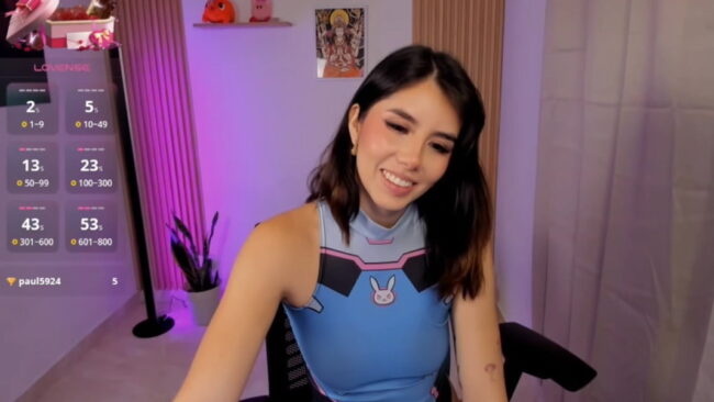 There are two toys on a shelf behind Lilyrouse_, who today is camming while wearing a one piece of the character D.Va from the Overwatch game, which is a piece that brings a lot of sexiness to her stream with how tight and form-fitting it is, and how well it shows her playing with her special gadgets.