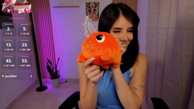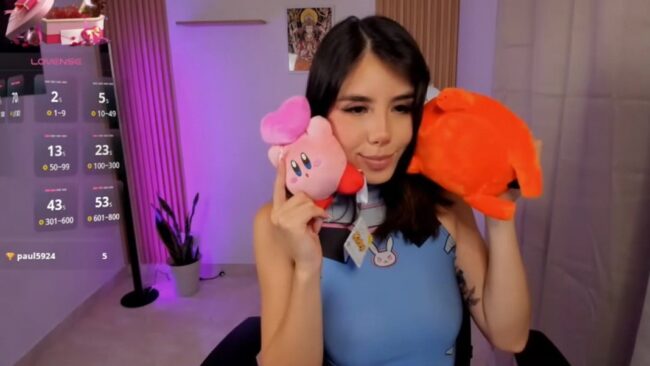 There’s a lot of cuteness in the way she moves, and I like that she takes the Kirby plushie in the background, as well as her soft Pochita toy from Chainsaw Man to pose with them in ways that bring a nice dose of sweetness to her stream.