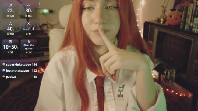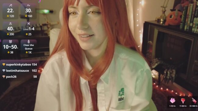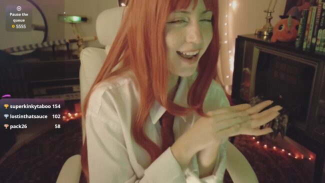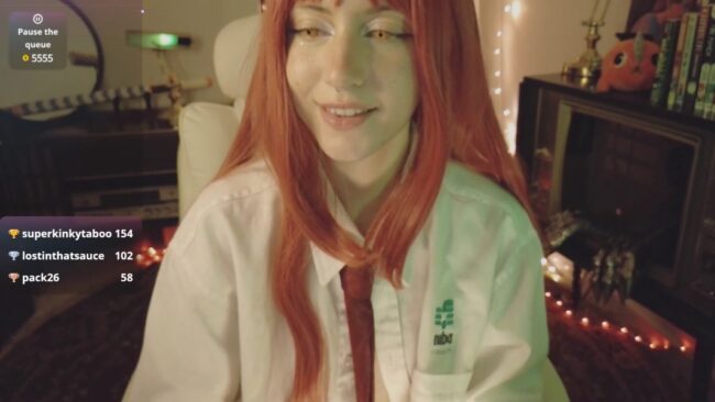 Alaskagrace looks gorgeous on this stream where she is camming as Makima from Chainsaw Man, and while she is wearing devil-like yellow contacts on her eyes to go with the red hair from the original character, she adds a whole lot more cuteness to her cosplay, which mixes marvelously with the activities in her room.