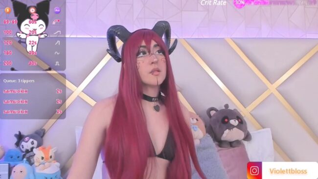 Often, when experiencing a vision such as this one, a rude awakening shatters the dream, bringing us back to reality. Lucky for us, this is not the case in this instance, as Violettbloss’ beauty is real and breathtaking, and she is showing us a doorway to more delights on this cam show where she charms us with the sweet magic of her succubus cosplay.