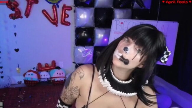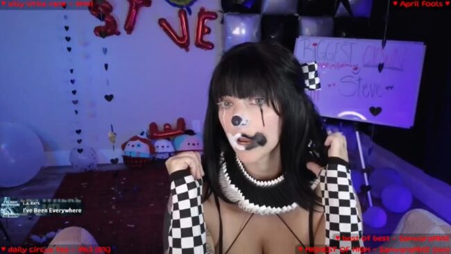 MollyMeowz offers us a special treat on this cam show where she dresses as a clown, but instead of the traditional hyper color associated with their portrayal, she instead goes for something different that sticks to light and dark patterns that work together swimmingly.