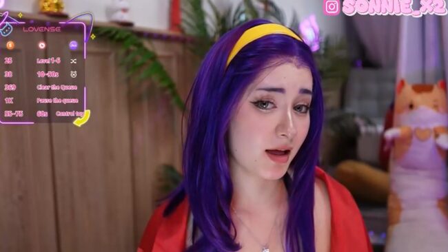 Sunny_Sonnie always plays with cuteness on her cam shows, and this one has a particular treat where she takes off her red robe and yellow jacket to get more comfortable in the rising temperature, and she stays only with a black top with straps that at times are hidden by her lovely purple hair, and as we’re watching, an exhilarating effect happens that makes it seem that she’s not wearing anything at all, which is a marvelous visual that brings more amazing allure to her fantastic portrayal of this anime character.