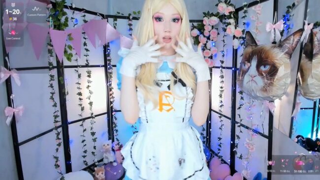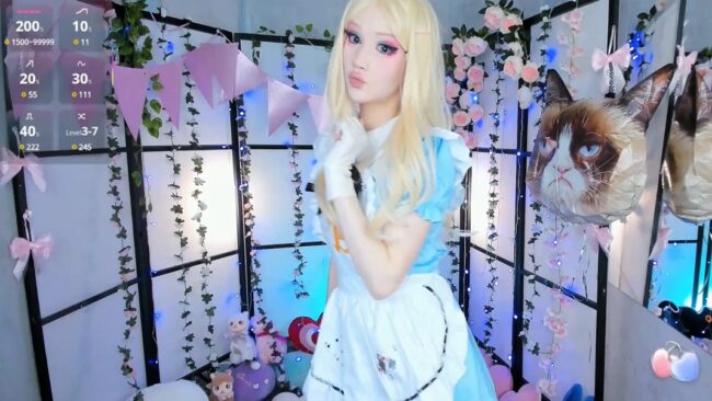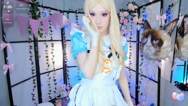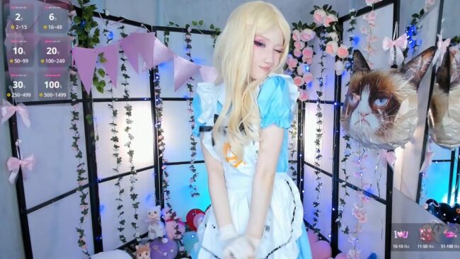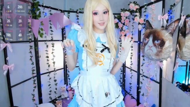 The balance on this cam show by the adorable Milkycute is fantastic. She’s wearing a blue dress and a white apron that together create a marvelous cosplay of Alice from the story Alice in Wonderland.