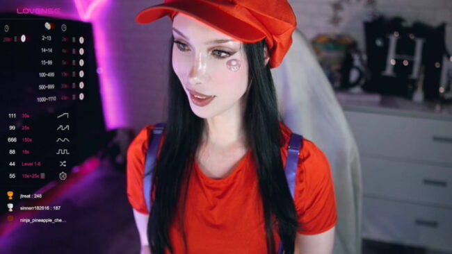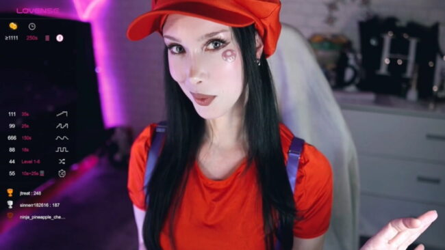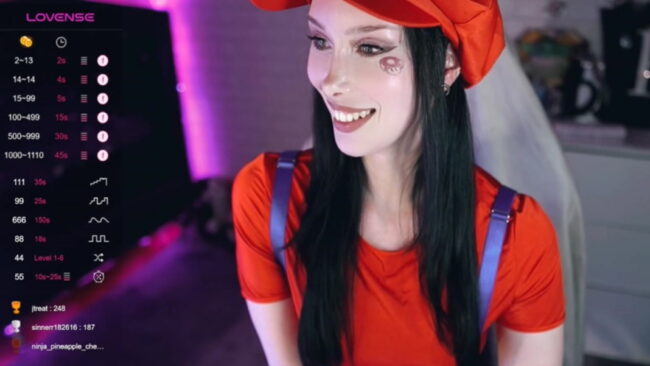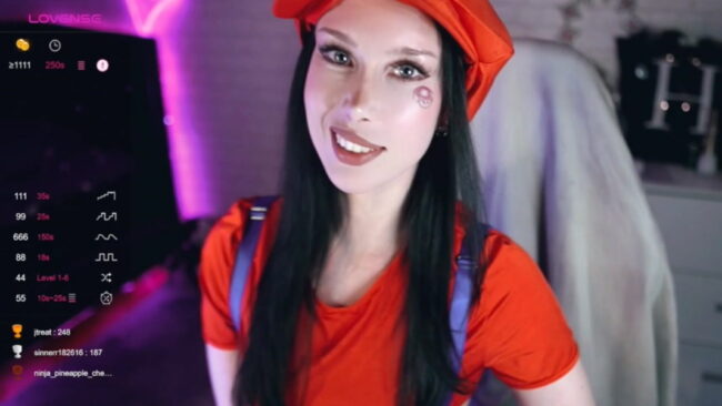 The look that Uindi is going for on this live stream is nothing short of brilliant, as she cams while wearing a tiny red top and overalls that cover just the essentials, but that marvelously transform her into a sexy Mario from the Super Mario Bros. games.