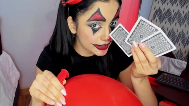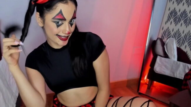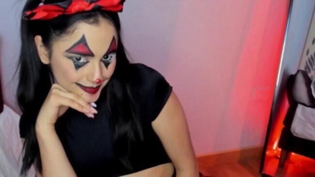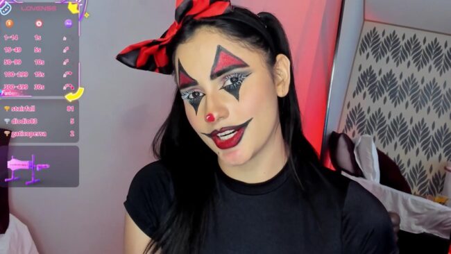 Camilaandrade_ has decorated her beautiful face with some colorful details like a Harlequin, and to fulfill this fabulous concept, she is also inviting us to watch how she plays with some cards and balloons while she also brings some spicy tricks like her showing us her flexibility a little bit while the mirror behind her reflects all her beauty back from a breathtaking angle that makes her stream even more exhilarating and surprising.