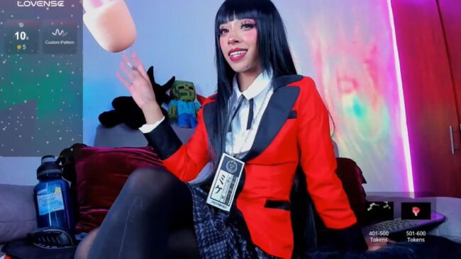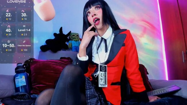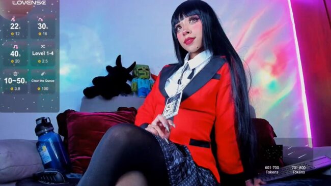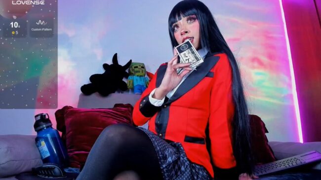 This is a beautiful transformation. Lololexa is in full gear with her straight long hair, a red jacket, sexy stockings and a skirt that completes the Kakegurui: compulsive Gambler cosplay she’s doing for this cam show.