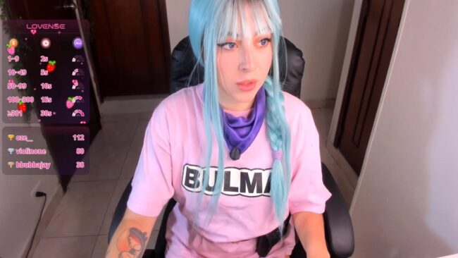 Cuteness and a sexy energy come together in this stream by Violetaarey as she plays and allures with a cosplay of Bulma from the Dragon Ball series, and she does it in a fantastic way that makes her stream an unforgettable adventure.