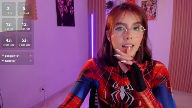 Lilyrouse_ swings into action with a spectacular cosplay of one of my favorite superheroes, and I like that this lovely girl keeps the mask off but her glasses on as this gives her look more authenticity, which is amazing for this cam show.