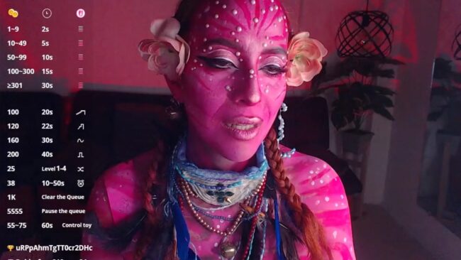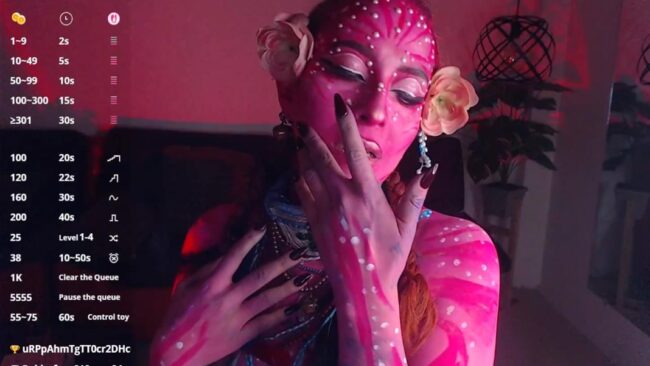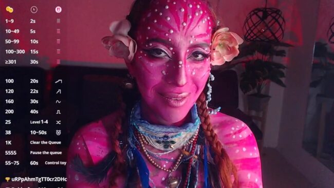 Sahra_Tayl0r_ has an exquisite attractive energy that’s irresistible, and she presents that power while she cosplays a variant of a Na’vi from the movie Avatar, only instead of blue, she goes with pink and red notes on her body paint, and she even adds a touch of that connection with nature that the Na’vi are known for with two lovely flowers decorating her breathtaking look.