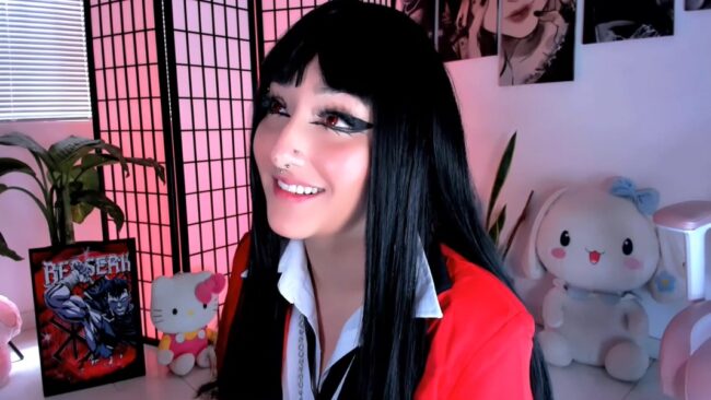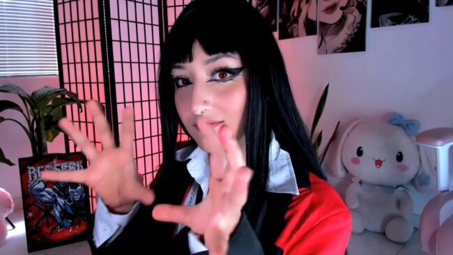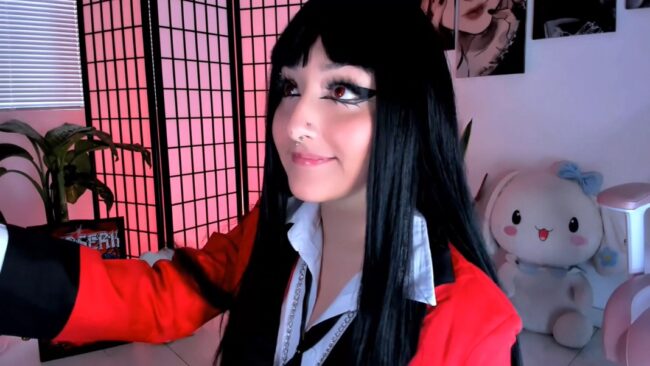 It is lovely to see _Julyana_ slowly unbuttoning her blouse in a sexy display, gradually creating a cleavage that deepens while we get to savor each moment of allure she offers through her portrayal of Yumeko Jabami from the anime Kakegurui – Compulsive Gambler.