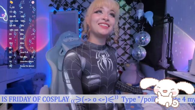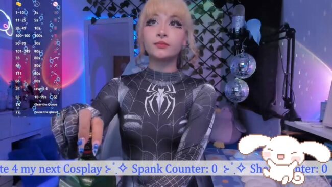 While she dazzles us with her cosplay of Spidey, the stunning _Heavenly_Blue_ also invites us to celebrate with her that she graduated, and to mark the ocassion she’s drinking shots of Jäger while also letting some alluring details show like her ahegao expressions that spice up her show and hint at the coming playfulness.
