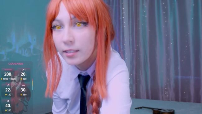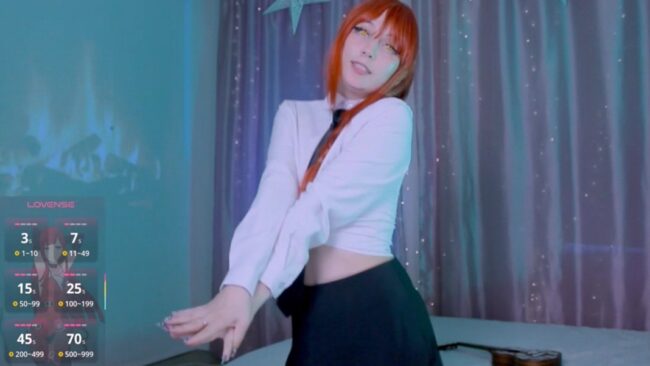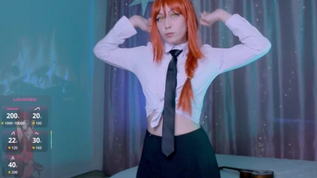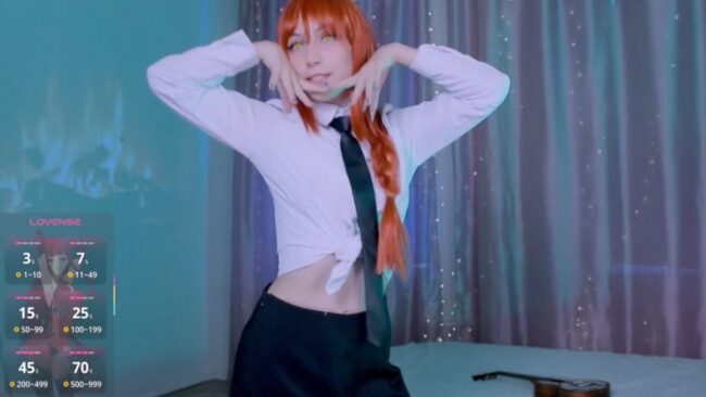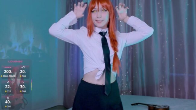 She is wearing a fun office attire with orange hair and yellow eyes that transform her into Makima from Chainsaw Man, except her portrayal of the character is much more relaxed and lovely, which Ahegame shows while she dances and moves spiritedly in her room showering us with more of her cuteness and that fantastic anime touch that makes her characterization even more exceptional.