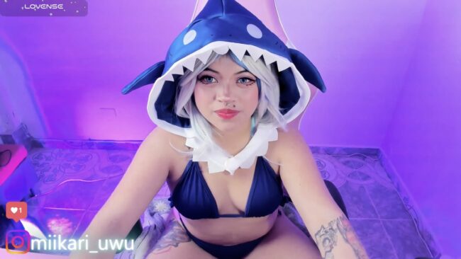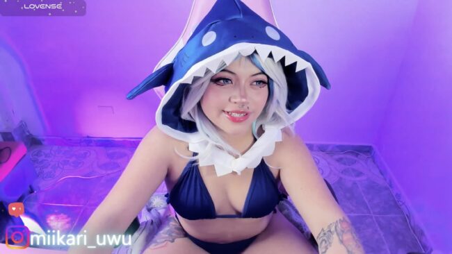 The hoodie hangs open over a bikini that says ocean vibes louder than a tidal wave, turning every step into a sharknado of fanservice and fish puns. Fins, fangs, and that iconic shark hood framing the face like a portable aquarium mascot, she is really making sure to put it all on. Tattoos of tiny chibi sharks swim across the skin like bonus DLC, while the outfit itself feels like cosplay designed by Poseidon after a few piña coladas.