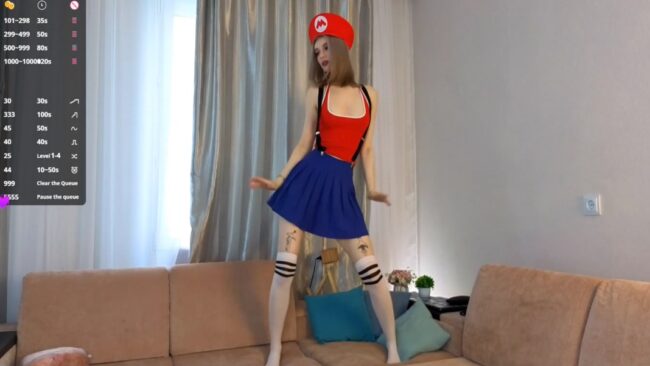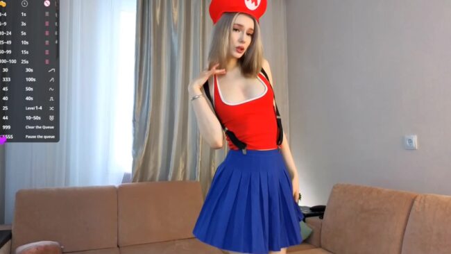 Odeliabrownell transforms into a sexy Super Mario for this stream, but her style has some variants that make it seamlessly sexy, like the substitution of the overalls for suspenders that hold a short blue skirt that holds lots of spicy secrets underneath it, and which matches the allure of that red top she wears, which also comes off to power-up her captivating energy.