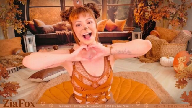 ZiaFox herself has an outfit that also follows this warm and inviting hue, and her clothes have a sexiness to them that hints at the more daring things to come on this stream where she has painted her face and adjusted her hairstyle so she looks like a cute bear.