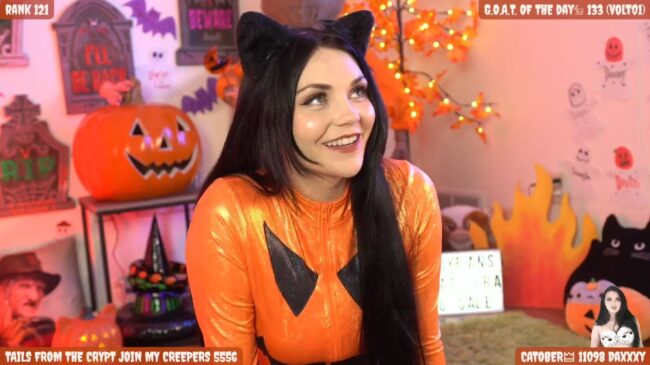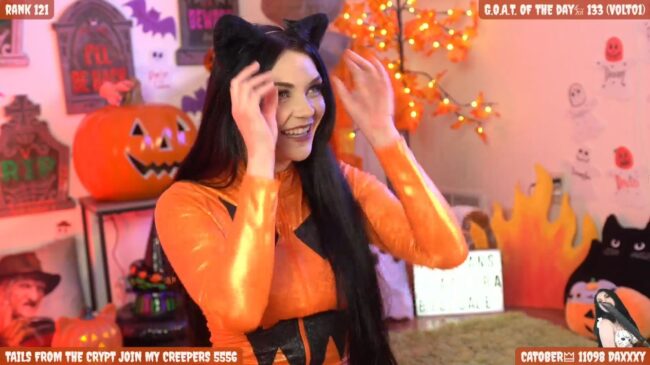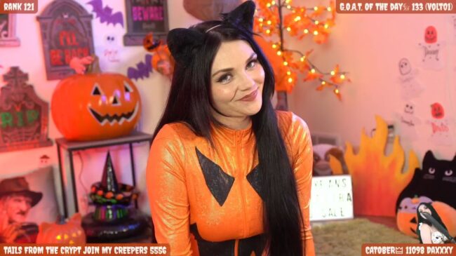 It has been some years since I’ve managed to catch some of a Catjira stream and, if anything, she just gets more beautiful every year. She has always especially fun around the fall holidays. Today, she looks fetching in an orange jack o’lantern-inspired jumpsuit and cat ears. I think the most amusing cosplay I’ve seen her do was when she dressed up as Bambie’s mom, which took both makeup skills and a wicked sense of humor. I was very happy to have her grace the cover of Bazowie Magazine with a Catjira take on Mortal Combat cosplay. I love when streamers and creators contribute to popularizing cosplay and spreading the word on these sorts of fandoms and I really enjoy Catjira‘s work. It is free today to join and friend her on the site to be sure you know when she is planning to stream her costumed goodness.