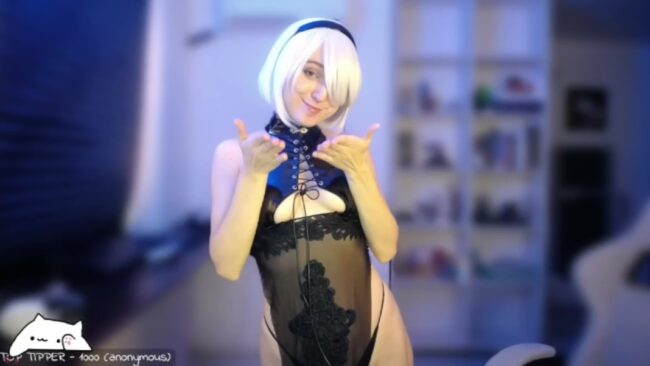 Meowlexx is 2B tonight, and I like her cosplay a lot. I think the variant or alternate costume she shows us with the sheer lingerie-style items is very close to the original character from the game Nier: Automata, only with a little more spice and cuteness.