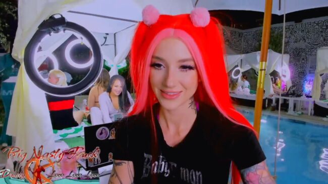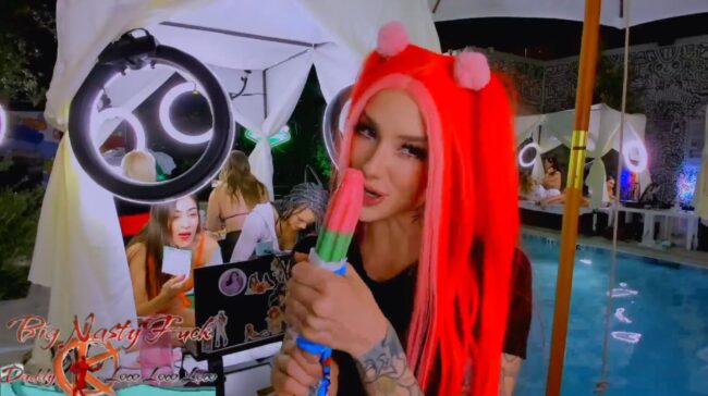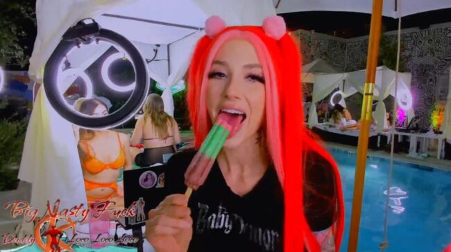 The gorgeous KasaraWood is streaming poolside at the MFC Social and demonstrating her popsicle skills. Her ice pop is sort of pink, green, and eggplant (colored, not flavored) and she says it tastes good. She is cosplaying Mira from Kpop Demon Hunters. A lot of the time, a challenge of cosplaying a character who is good-looking is that the live action version can sometimes seem underwhelming or at least challenging to get right. KasaraWood is so supernaturally beautiful, however, that she is actually better looking than the cartoon. No shade to Mira; KasaraWood is just exception. During the MFC Social, it is free to set up a profile and see how many cosplays you can identify.