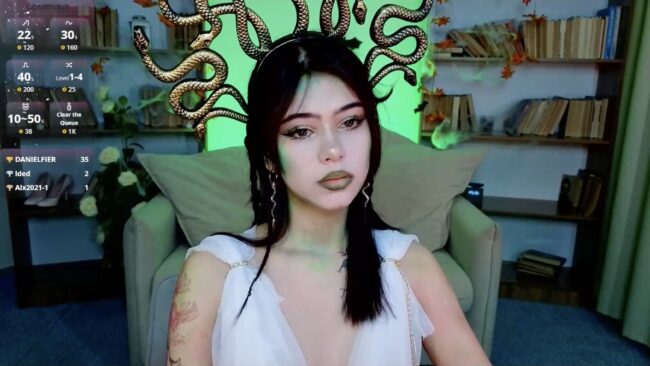 The white dress drapes like it was stolen off a marble statue, soft and divine against the chaos of that golden snake crown. Each serpent coils with attitude, mid-hiss, like they’re gossiping about Perseus behind her back. The green light hits just right, casting that underworld glow across her skin which is part goddess, part caution sign. Her lips shimmer in olive venom, eyes flashing like they’ve seen too many heroes with mirrors and bad intentions. The kind of stare that could turn a whole Spartan battalion into garden décor.