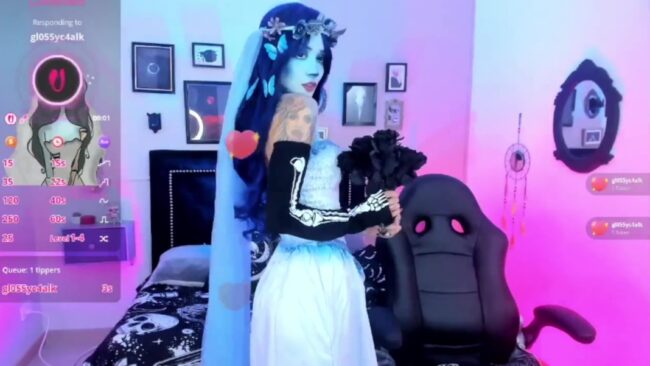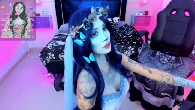 IsisRaichuu is dressed as a corpse bride with little butterflies on her hair and subtle tones of blue all over her white gown. Her costume also includes some details on one side of her body that are more skeleton-like. It is a very tasteful detail that makes her lovely look even more creative and Halloweeny.