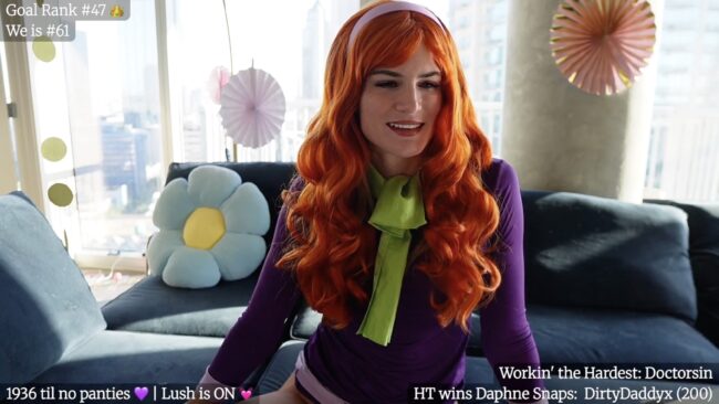 Giaversary‘s Daphne walks in like the mystery’s already solved and the answer is fashion. The purple dress hugs just right, that 60s hemline doing overtime while the green scarf ties it all together like a bow on a very stylish crime scene. Her headband’s sitting perfectly in that red hair, because not even a haunted mansion can mess with her blowout!