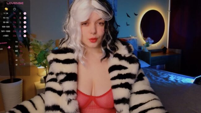 Cruella doesn’t enter a room, but Belladevile_ makes sure to claim it. The air shifts when she shows up, heels clicking, coat flaring, attitude louder than any introduction. Her hair’s a perfect disaster, split clean down the middle, black and white like she made a deal with symmetry itself.