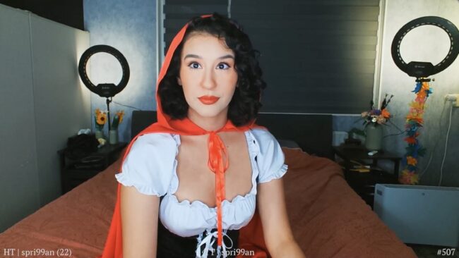 The red cloak swishes behind her like a walking warning sign, bright enough to make wolves lose focus mid-snarl. The hood’s pulled low, a little mysterious, a little mischievous and I don’t think she’s gunning for the sweet little girl on her way to Grandma’s version. The dress underneath is forest chic: corset laced tight, skirt short enough to make fairy-tale purists faint.