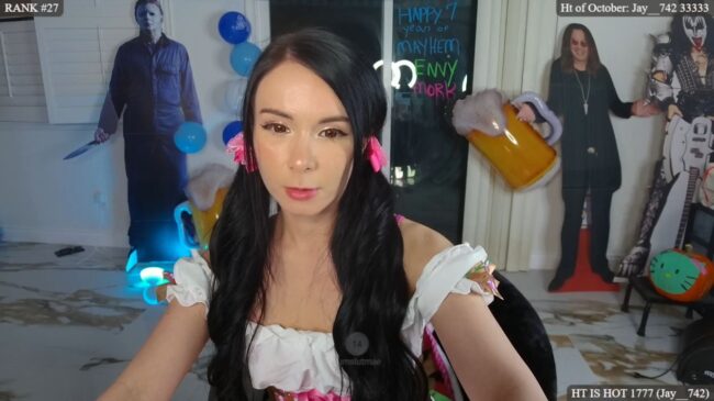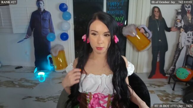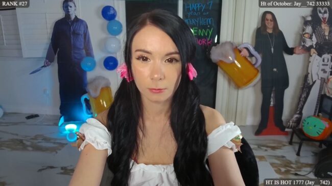 MollyMayhem is celebrating lucky seven years of streaming. She is rocking her Octoberfest outfit and looking adorable. (Okay, technically she is now rocking no outfit except pigtails, but I got a snap of her beer garden babe costume in the nick of time.) I like her Michael Myers and Ozzy Osbourne standees. Earlier, she was firing confetti cannons. This means she had to lock her cats out of the room because kitty cats do not love sparkly explosions as much as everyone in her chatroom does. She says she just found some confetti in some humorous places upon her person. It is free this Halloween to stop by MollyMayhem‘s digital Octoberfest and see where you spot bits of glittery confetti. You can tip to get your name on the wall.