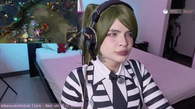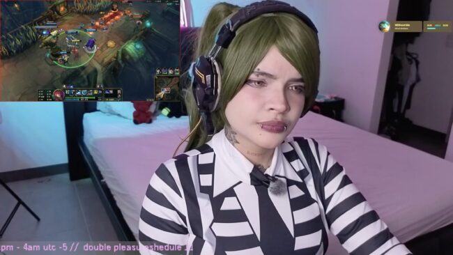 Imagine Beetlejuice but make it somehow even more chaotic. The striped outfit’s still there, black and white, sharp as ever, but now Noxarcanee is sitting in front of a monitor yelling at randoms in ARAM. The green hair glows like it’s powered by pure toxicity, and the headset’s probably haunted at this point.