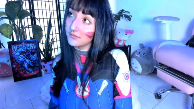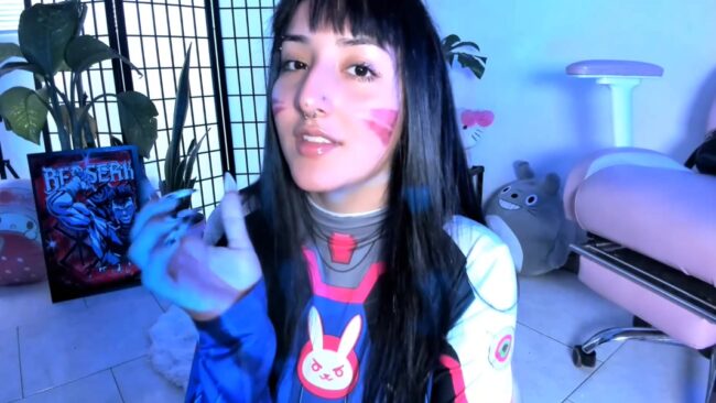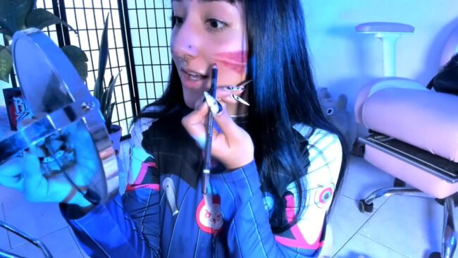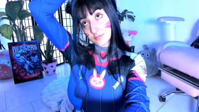 Her outfit is wonderfully form-fitting, which results in some of her concealed piercings showing through the fabric while she dazzles us with her look of D.Va from the Overwatch games, and _Julyana_ presents this style very well with the makeup details on her face, and all the fun things she shows us with the completed ensemble.