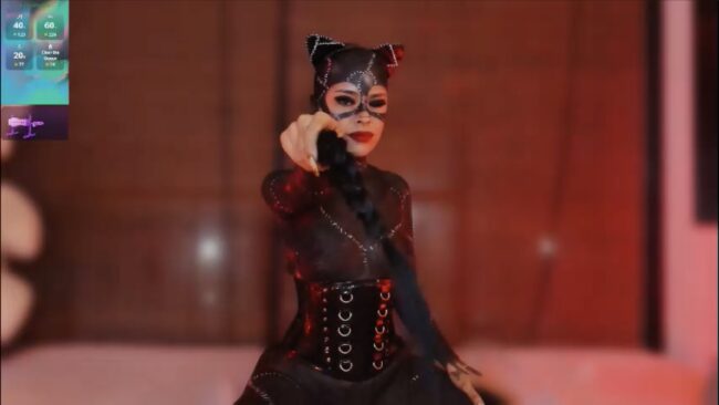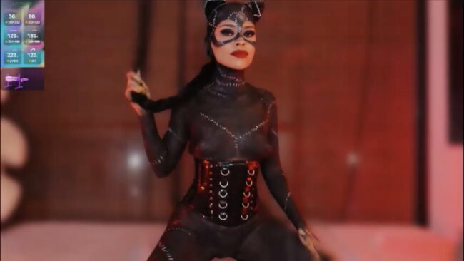 Z_e_t_h_a‘s Catwoman look is a full-on masterpiece of body paint, a living canvas that captures every glossy, stitched detail from Michelle Pfeiffer’s iconic Batman Returns suit. The black paint gleams under the light like patent leather, every stroke creating that same slick, feline texture that made the original costume unforgettable.