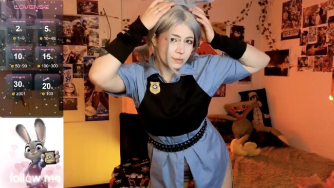 The uniform is on point with the blue police gear complete and the badge of honor, plus the kind of confidence that says she’s arrested at least three raccoons for loitering near the donut shop. The black vest adds that tactical flair, and the belt? Definitely holding more sass than regulation equipment. She looks like she’s about to sprint down a suspect, trip over her own enthusiasm, and still solve the case before the coffee gets cold.
