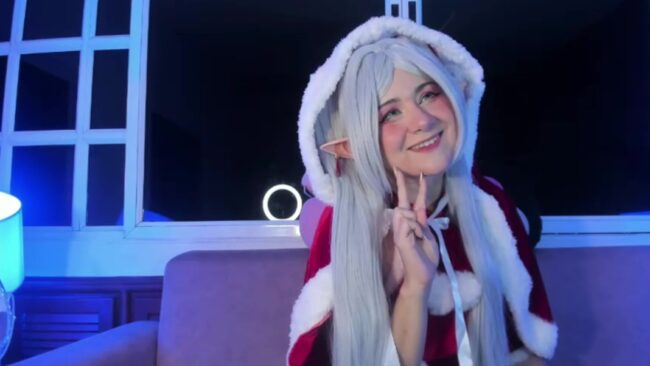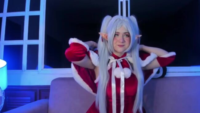 Harimoon combines the christmas spirit with a cosplay of Frieren from the anime of the same name, and she creates an alluring and super cute style with both concepts working seamlessly while she shares with us a wonderful time in her room, and it is a time that also includes some sexy sights in the form of close ups of how short her Santa girl dress is.