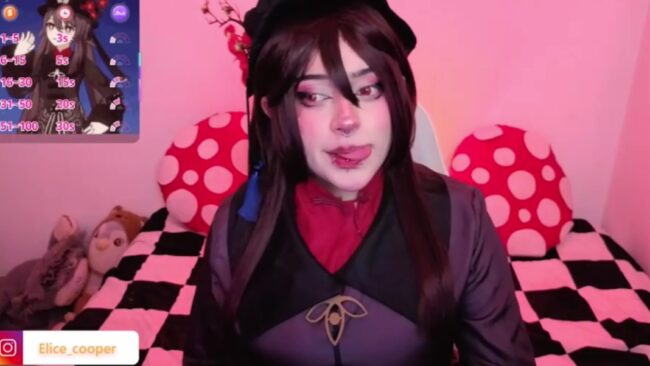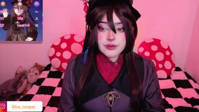 This marvelous stream presents us Elicecooper dressed as Hu Tao from the RPG Genshin Impact, and I love how the red on her lips goes with the red of part of her clothes, and also how cute her hair looks, especially that bit that falls between her eyes.