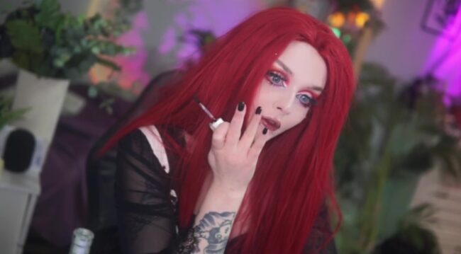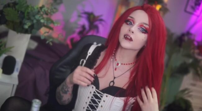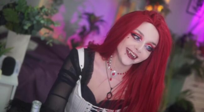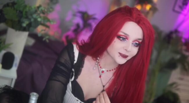 It is also a zesty and lovely event, this cam show, and I love seeing Faith_Chan as she touches up her makeup and interacts with the room while wearing a necklace with red gems that match the rich tone of her hair, lips and eyeshadow; as well as fangs that give a sense of bold sexiness to her unique cosplay that’s especially vibrant.
