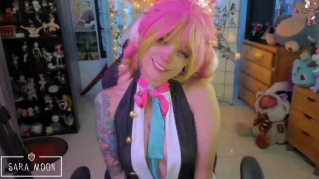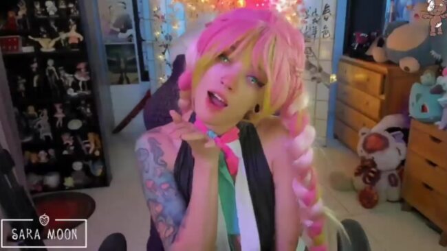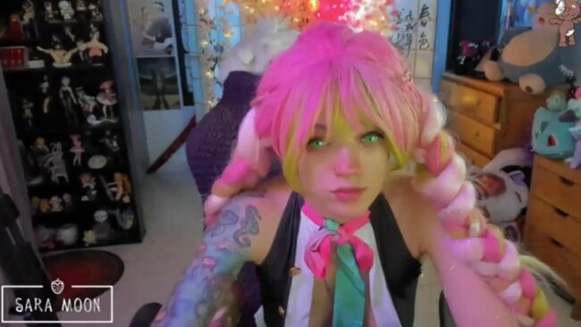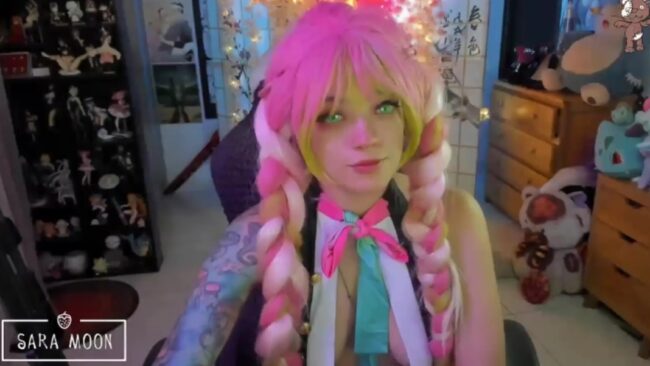 Sara_Skys is Mitsuri Kanroji today. Her hair is pink and with big braids that decorate the cuteness of her face. I also appreciate that her top doesn’t cover the tattoos on her arm, and how she conceals the cleavage of her top with her green tie and a bit of her hair, particularly because it makes the eventual reveal of her lovely attributes much more exhilarating. It is a surprise that’s always welcome.
