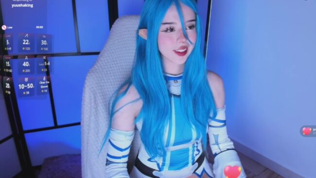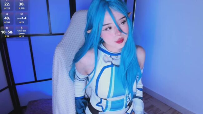 The matching tones of this cosplay are breathtaking. Ta_Miau wears pointy ears like a lovely elf for this stream, and I like the combinations of blue that her hair and her clothes play with. It feels like a soothing ocean of beauty greeting our gaze and taking us to a lovely anime fantasy.