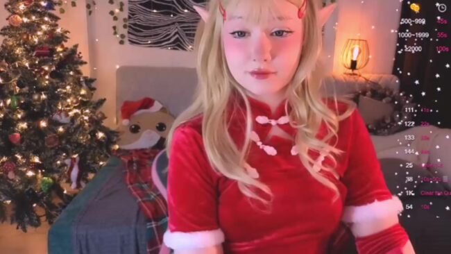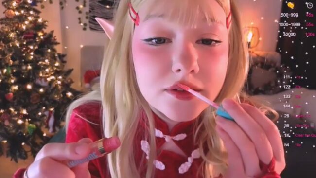 Irma_Bell is dressed in red, and I love that we get to see her touching up some details of her makeup, like the lovely gloss on her kissable lips, while she also sips from a mug in a way that feels cozy and cute, and which invites more loveliness into this magical live stream where she is cosplaying as a cute Christmas elf.