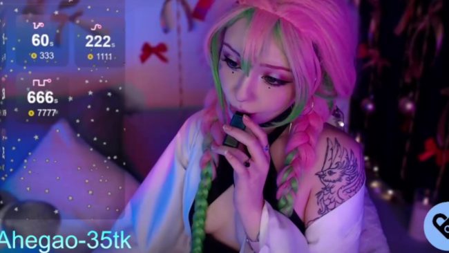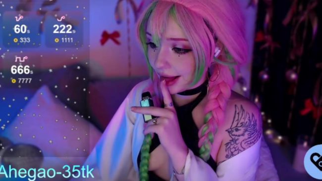 Lina_Diva’s top has a window that shows the outline of her attributes, and she’s also wearing the part that’s like a robe or kimono in a way that lets it show one of her shoulders, and the beautiful tattoo that decorates it. It is one of those lovely visuals that I appreciate a lot, especially with the colorful anime-style hair color that makes me think of sweet sherbet.