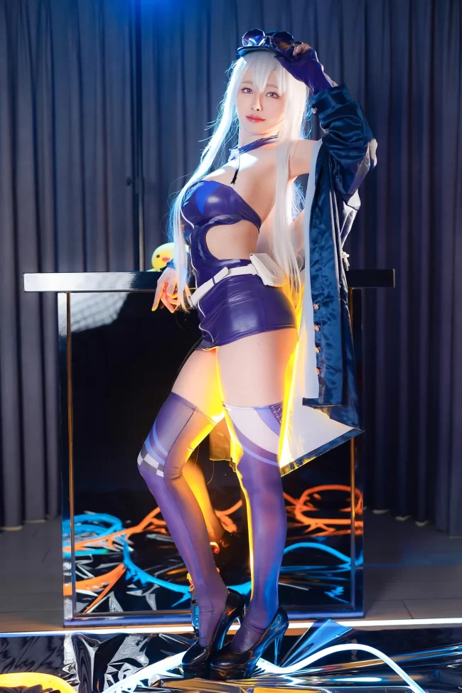 With her sharp white hair, confident stance, and an outfit that blends military chic with runway flair, Arty captures Enterprise’s commanding energy while adding her own spin of style and allure. The sunglasses alone feel like the perfect crossover moment—Enterprise as both an ace commander and a rockstar about to headline Coachella.