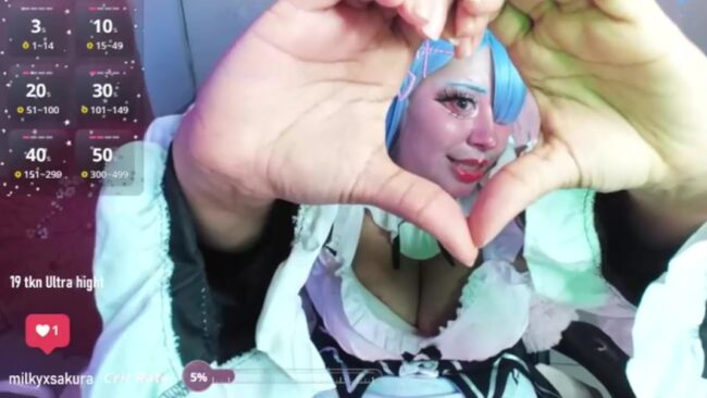 The cosplay that Milkysakura does on this stream comes from the anime Re: Zero, and Milkysakura presents the maid details of her outfit superbly while she portrays Rem in a way that shows some breathtaking enhancements, especially with how that cleavage of hers works its magic to blend cuteness and allure in a marvelous way that makes this cam show extra memorable.