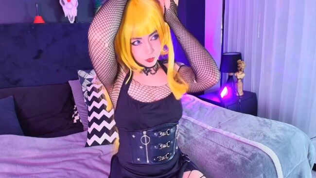 Aylen_Darkmoor is Misa Amane for this stream, and I really like the fishnets, the belts, and the corset she wears for this stream. They give a sexier look to the character she is portraying, while the anime-style hair she wears and the vibrant makeup take care of the loveliness in a way that makes her ensemble more endearing and breathtaking.
