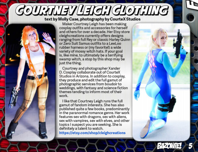 Maker Courtney Leigh has been making cosplay outfits and accessories for herself and others for over a decade. Her Etsy store cleighcreations currently offers designs ranging from full Rey or classic Harley Quinn or Zero Suit Samus outfits to a LeeLoo rubber harness or (my favorite!) a wide variety of mossy witch hats. If your goal is, like mine, to ultimately be a terrifying swamp witch, a stop by this shop may be just the thing.