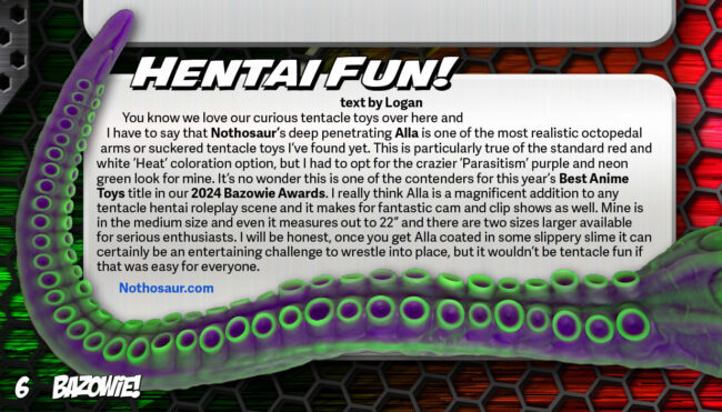 You know we love our curious tentacle toys over here and I have to say that Nothosaur’s deep penetrating Alla is one of the most realistic octopedal arms or suckered tentacle toys I’ve found yet. This is particularly true of the standard red and white ‘Heat’ coloration option, but I had to opt for the crazier ‘Parasitism’ purple and neon green look for mine. It’s no wonder this is one of the contenders for this year’s Best Anime Toys title in our 2024 Bazowie Awards. I really think Alla is a magnificent addition to any tentacle hentai roleplay scene and it makes for fantastic cam and clip shows as well. Mine is in the medium size and even it measures out to 22” and there are two sizes larger available for serious enthusiasts. I will be honest, once you get Alla coated in some slippery slime it can certainly be an entertaining challenge to wrestle into place, but it wouldn’t be tentacle fun if that was easy for everyone.