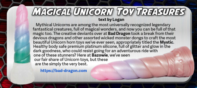 Mythical Unicorns are among the most universally recognized legendary fantastical creatures, full of magical wonders, and now you can be full of that magic too. The creative deviants over at Bad Dragon took a break from their devious dragons and other assorted wicked monster dongs to craft the most beautiful Unicorn horn toys we’ve ever seen, appropriately titled The Mystic. Healthy body safe premium platinum silicone, full of glitter and glow in the dark goodness, who could resist going for an adventurous ride with one of these stunners? Here at Bazowie, we’ve seen our fair share of Unicorn toys, but these are the simply the very best.