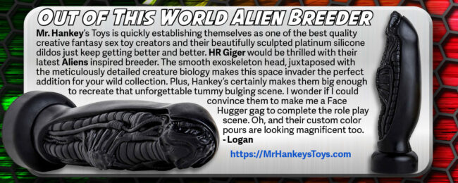 Mr. Hankey’s Toys is quickly establishing themselves as one of the best quality creative fantasy sex toy creators and their beautifully sculpted platinum silicone dildos just keep getting better and better. HR Giger would be thrilled with their latest Aliens inspired breeder. The smooth exoskeleton head, juxtaposed with the meticulously detailed creature biology makes this space invader the perfect addition for your wild collection. Plus, Hankey’s certainly makes them big enough to recreate that unforgettable tummy bulging scene. I wonder if I could convince them to make me a Face Hugger gag to complete the role play scene. Oh, and their custom color pours are looking magnificent too.