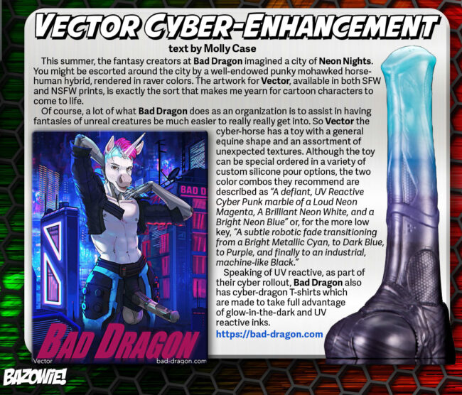 Of course, a lot of what Bad Dragon does as an organization is to assist in having fantasies of unreal creatures be much easier to really really get into. So Vector the cyber-horse has a toy with a general equine shape and an assortment of unexpected textures. Although the toy can be special ordered in a variety of custom silicone pour options, the two color combos they recommend are described as “A defiant, UV Reactive Cyber Punk marble of a Loud Neon Magenta, A Brilliant Neon White, and a Bright Neon Blue” or, for the more low key, “A subtle robotic fade transitioning from a Bright Metallic Cyan, to Dark Blue, to Purple, and finally to an industrial, machine-like Black.”